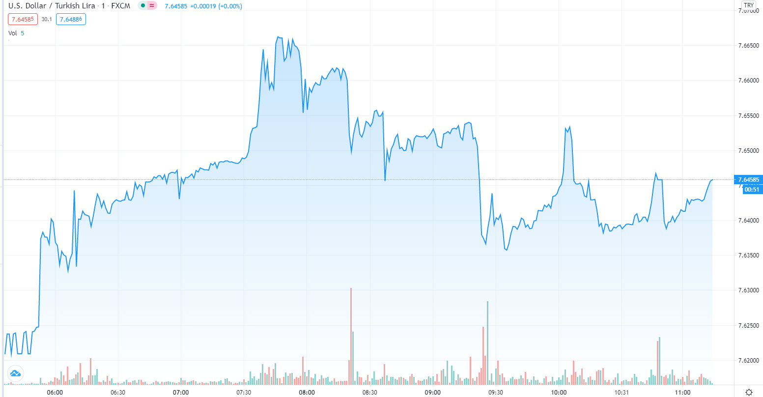 Η ιστομία του τουρκικού νομίσματος με το δολάριο είναι στο 7,6426, μια ανάσα από τα επίπεδα του αρνητικού ιστορικού ρεκόρ, επίπεδα που οι παρεμβάσεις της κεντρικής τράπεζας – με εντολή Ερντογάν – πασχίζουν να διατηρήσουν.