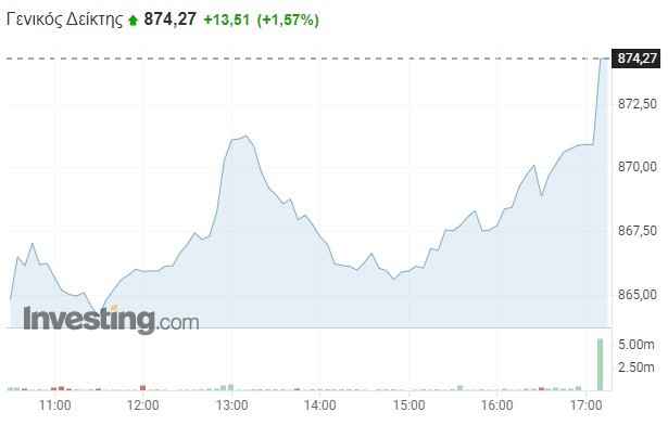 Πιο συγκεκριμένα, κατά τη διάρκεια της Δευτέρας, ο Γενικός Δείκτης σημείωσε ισχυρή άνοδο κατά 1,57% και διαμορφώθηκε στις 874,27 μονάδες, κερδίζοντας 13,5 μονάδες σε σχέση με το κλείσιμο της Παρασκευής (860,76 μονάδες). Αποτέλεσμα ήταν η μηνιαία μεταβολή να φθάσει στο εντυπωσιακό +10,3%.