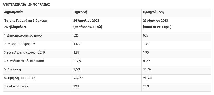 Δημοπρασία γραμματίων διάρκειας 26 εβδομάδων, ύψους 625 εκατομμυρίων ευρώ διενεργήθηκε από τον ΟΔΔΗΧ. Η απόδοση διαμορφώθηκε στο 3,50%, έναντι 3,15% στην δημοπρασία τέλος Μαρτίου.