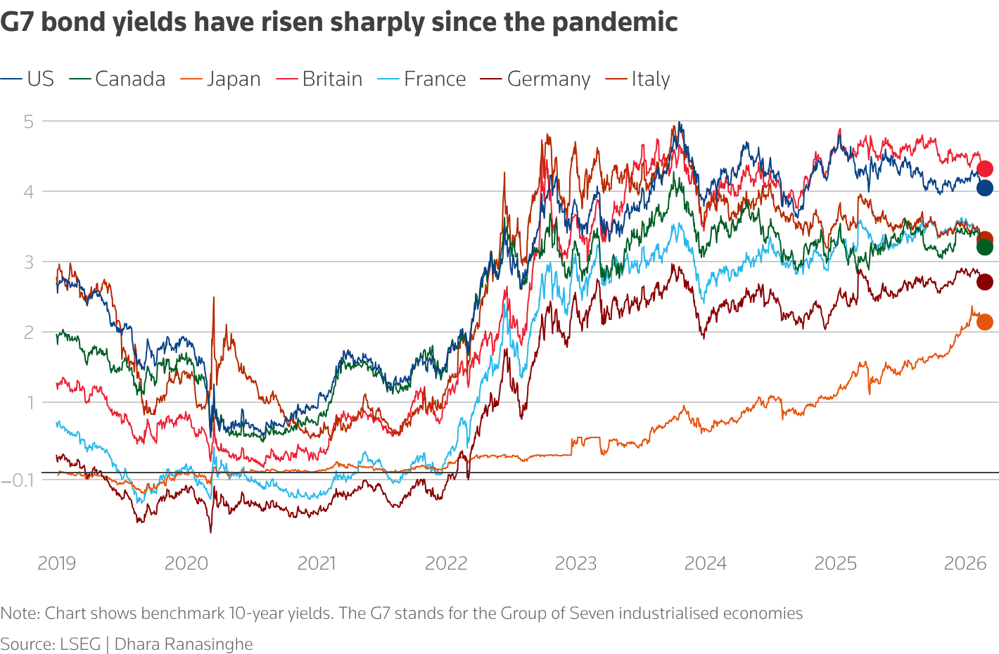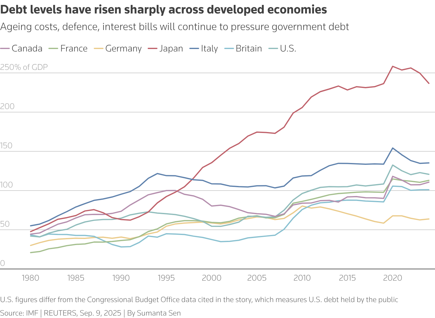 Το χρέος υπερβαίνει το 100% του ΑΕΠ στις περισσότερες ανεπτυγμένες οικονομίες και αναμένεται να αυξηθεί λόγω του κόστους της γήρανσης του πληθυσμού, των τόκων και της πίεσης για περισσότερες δαπάνες στην άμυνα και την κλιματική αλλαγή.