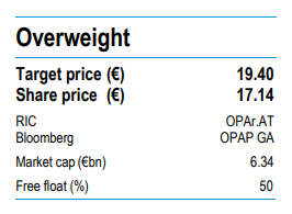 Η χρηματιστηριακή εταιρεία συνεχίζει να δίνει τιμή στόχο 19,4 ευρώ για τη μετοχή του ομίλου και σύσταση overweight (υπεραπόδοση). Σε +13,19% καθορίζεται το περιθώριο ανόδου σε σχέση με το χθεσινό κλείσιμο του τίτλου στα 17,14 ευρώ.