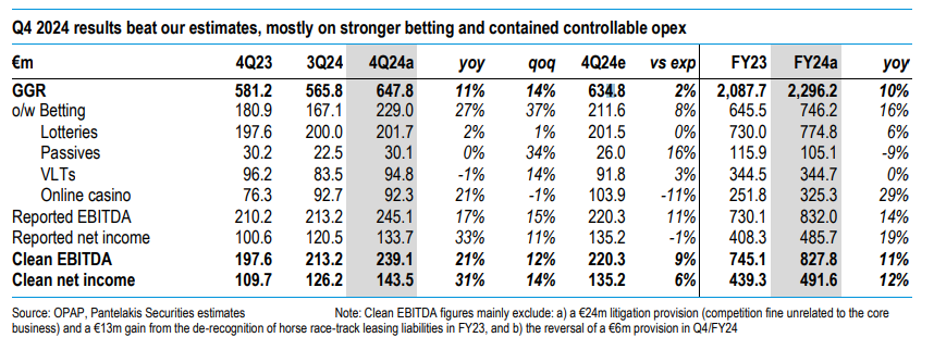 Θετικά αποτιμά η Pantelakis Securities τα οικονομικά αποτελέσματα δ’ τριμήνου και χρήσης 2024 του ΟΠΑΠ, εστιάζοντας στο βελτιωμένο guidance για το 2025.