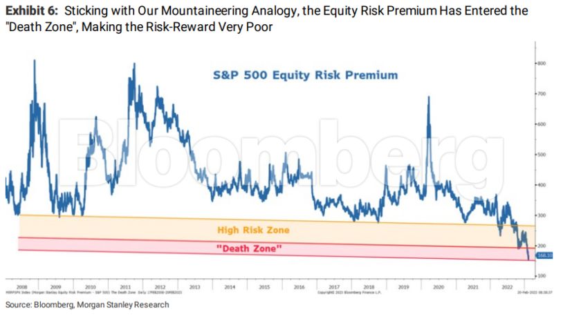 Το ασφάλιστρο κινδύνου αυτό βρίσκεται σε επικίνδυνο σημείο, φαινόμενο γνωστό και ως «death zone» (ζώνη θανάτου), κάτι το οποίο αυξάνει την έκθεση των επενδυτών δυσανάλογα με τις αποδόσεις των τοποθετήσεών τους, ιδιαίτερα δεδομένης της συνεχιζόμενης επιθετικής νομισματικής σύσφιξης της Fed. Σύμφωνα με τον Ουίλσον, οι εκτιμήσεις κερδοφορίας πολλών παραμένουν 10% με 20% υψηλότερα απ’ όπου θα έπρεπε να βρίσκονται. Ο αναλυτής υπογράμμισε πως «ήρθε η ώρα να μεταβάλλουμε τις εκτιμήσεις μας πριν λάβει χώρα η επόμενη κατάρρευση των αγορών».