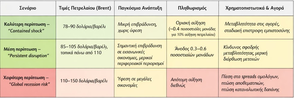 Σε μεσαίο σενάριο (με άλμα στα 85 με 105 δολάρια), η παγκόσμια οικονομία θα επιβραδυνθεί χωρίς να εισέλθει σε συγχρονισμένη ύφεση. Ωστόσο, σε ακραίο σενάριο (με εκτίναξη τιμών στα 110 με 150 δολάρια), οι απώλειες προσφοράς 10–15 εκατ. βαρελιών ημερησίως θα μπορούσαν να οδηγήσουν σε παγκόσμια ύφεση, με πτώση πραγματικών εισοδημάτων, αύξηση ανεργίας και συρρίκνωση επενδύσεων.