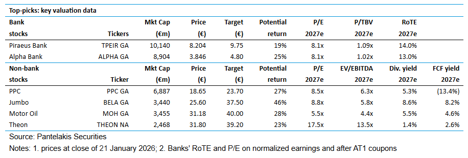 Με έμφαση στην αξία (value-biased) ορίστηκαν τα top picks από την Pantelakis, η οποία εστιάζει στην υπερβάλλουσα στάθμιση των τραπεζών και στις υποτιμημένες ποιοτικές μη χρηματοοικονομικές εταιρείες. Πιο συγκεκριμένα, κορυφαίες επιλογές για το 2026 αποτελούν η Τράπεζα Πειραιώς (overweight με τιμή στόχο 9,75 ευρώ), η Alpha Bank (overweight με τιμή στόχο 4,8 ευρώ), η ΔΕΗ (buy με τιμή στόχο 23,7 ευρώ), η Jumbo (τιμή στόχος 37,5 ευρώ), η Motor Oil (overweight με τιμή στόχο 40 ευρώ) και η Theon (buy με αναβάθμιση της τιμής στόχου στα 39,2 ευρώ). Το περιθώριο ανόδου των παραπάνω top picks, σε σχέση με τα τρέχοντα επίπεδα, υπολογίζεται μεταξύ 19% και 46%.