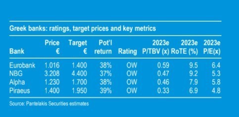 Η Pantelakis συστήνει overweight για όλο τον τραπεζικό κλάδο. Η τρέχουσα αξιολόγηση σε 0,46 φορές τη λογιστική αξία και 5,6 φορές τα κέρδη ανά μετοχή μετά την εξυγίανση αφήνει άφθονο περιθώριο ασφαλείας, εξηγεί η χρηματιστηριακή.