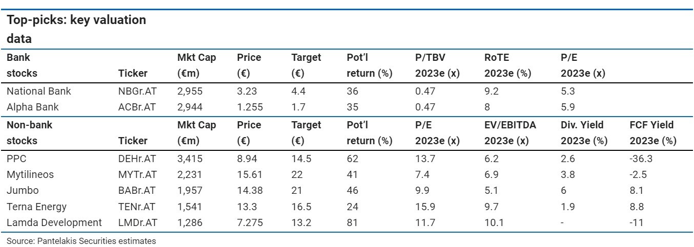 Η χρηματιστηριακή είναι overweight στον τραπεζικό τομέα, με την ΕΤΕ και την Alpha να είναι οι τραπεζικές επιλογές στον τομέα. Δεύτερον, προτιμά υποτιμημένα ονόματα (Jumbo και Lamda Dev), όπου μια μυωπική αγορά είναι ιδιαίτερα απαισιόδοξη για τις μελλοντικές προοπτικές, είτε στις υφιστάμενες δραστηριότητες είτε σε νέα εγχειρήματα (έργο Ελληνικό). Τέλος, εν μέσω της αναταραχής στις αγορές ενέργειας, επιδιώκει αυξημένη έκθεση σε μετοχές που θα ηγηθούν της πράσινης μετάβασης (ΔΕΗ, Μυτιληναίος και Τέρνα Ενεργειακή).