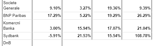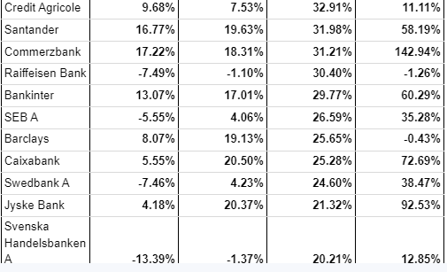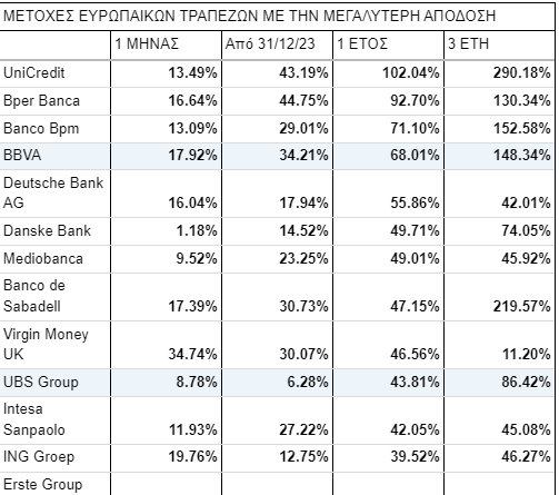 Στον παρακάτω πίνακα φαίνεται η πορεία των ευρωπαϊκών τραπεζών που συμμετέχουν στον δείκτη Eurostoxx600 και είχαν την μεγαλύτερη απόδοση των μετοχών το τελευταίο έτος.