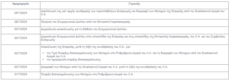 Το αναμενόμενο χρονοδιάγραμμα της εισαγωγής του συνόλου των μετοχών της Εταιρείας στο Χ.Α. παρουσιάζεται ακολούθως: