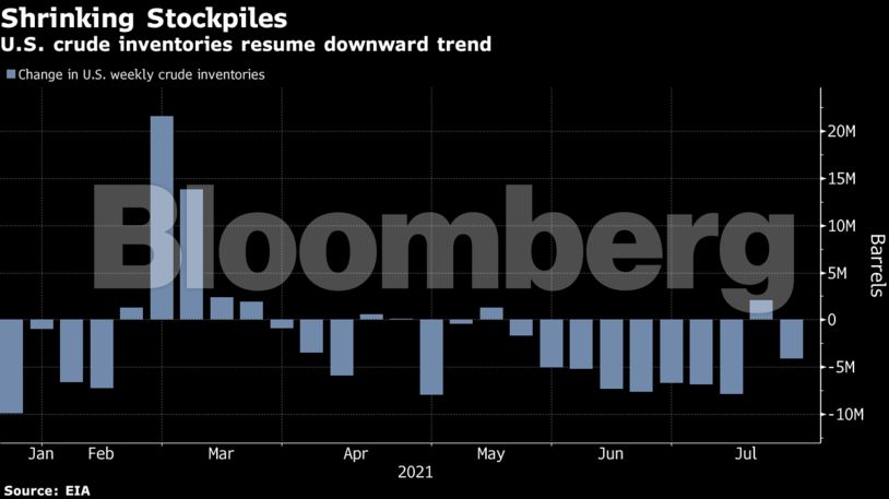 Τα αμερικανικά αποθέματα συρρικνώθηκαν κατά 4,09 κατ. Βαρέλια την περασμένη εβδομάδα, έναντι πρόβλεψης του Bloomberg για μείωση κατά 2,5 εκατ. βαρέλια. Τα αποθέματα βενζίνης επίσης μειώθηκαν, υποχωρώντας κατά 2,25 εκατ. βαρέλια.