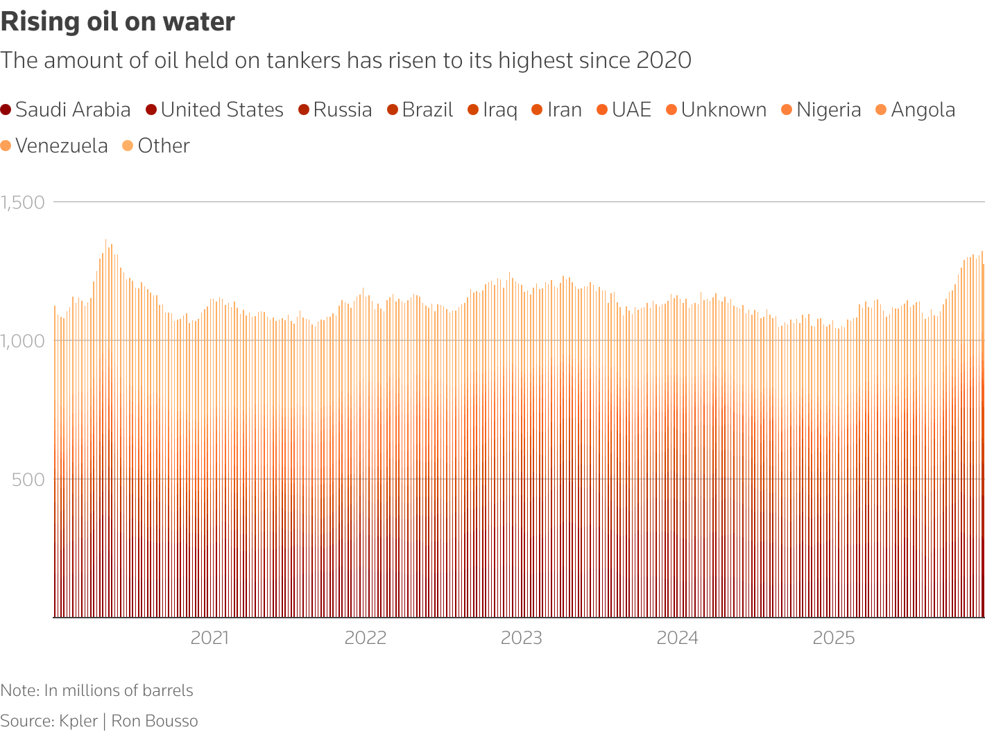 Το ρωσικό αργό πετρέλαιο που μεταφέρθηκε μέσω θαλάσσης αυτή την εβδομάδα ήταν περίπου 155 εκατομμύρια βαρέλια – περίπου 55% υψηλότερο από τον Ιανουάριο – καθώς οι ασιατικοί αγοραστές διστάζουν να μεταφέρουν αυτά τα βαρέλια στην ξηρά μετά τις νέες αμερικανικές κυρώσεις στους ρωσικούς ενεργειακούς κολοσσούς Rosneft και Lukoil.