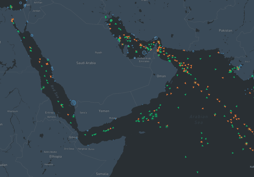 Παρακάτω παρουσιάζεται ένας χάρτης των δεξαμενόπλοιων αργού πετρελαίου που βρίσκονται στα ύδατα της Μέσης Ανατολής την Τετάρτη, ο οποίος παρέχεται από την Kpler.