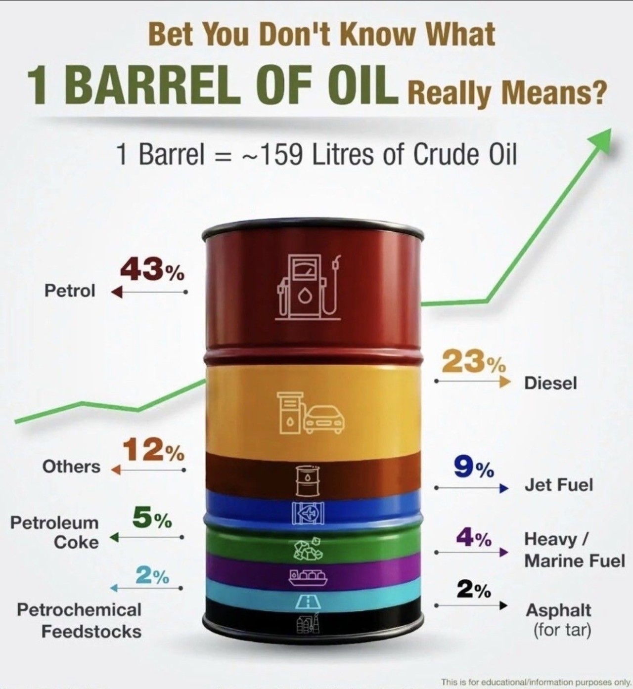 Ένα και μόνο βαρέλι πετρελαίου -που αντιστοιχεί σε περίπου 159 λίτρα- δεν καλύπτει απλώς ενεργειακές ανάγκες, αλλά τροφοδοτεί ένα ευρύ φάσμα οικονομικών δραστηριοτήτων, όπως επισημαίνεται σε ανάλυση του Lloyd’s Maritime Institute. Συγκεκριμένα, το 43% της παραγωγής κατευθύνεται στη βενζίνη, στηρίζοντας τις οδικές μεταφορές, ενώ το 23% αφορά το ντίζελ, κρίσιμο για logistics, βαριά οχήματα και βιομηχανία. Επιπλέον, το 9% χρησιμοποιείται ως καύσιμο αεροσκαφών, διασφαλίζοντας τη διεθνή συνδεσιμότητα, και το 12% διοχετεύεται στην πετροχημική βιομηχανία για την παραγωγή πλαστικών και χημικών προϊόντων.