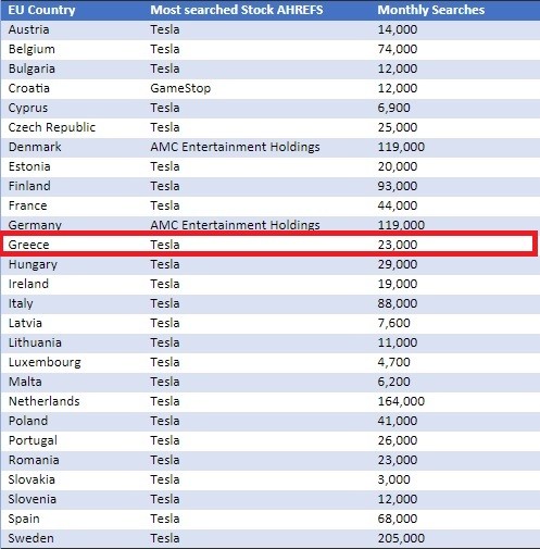 Ποια μετοχή αναζήτησαν περισσότερο οι Έλληνες στο Google; Σ’ αυτή την ερώτηση σπεύδει να απαντήσει η CMC Markets, η οποία καταγράφει τα «google search» στις χώρες της Ευρωπαϊκής Ένωσης.