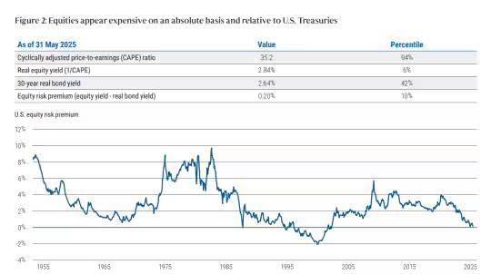 Η ομάδα επεσήμανε επίσης ότι το equity risk premium (ERP) είναι πλέον μηδενικό, κάτι που έχει συμβεί μόνο δύο φορές τα τελευταία 70 χρόνια: το 1987 και το 1996-2001.
