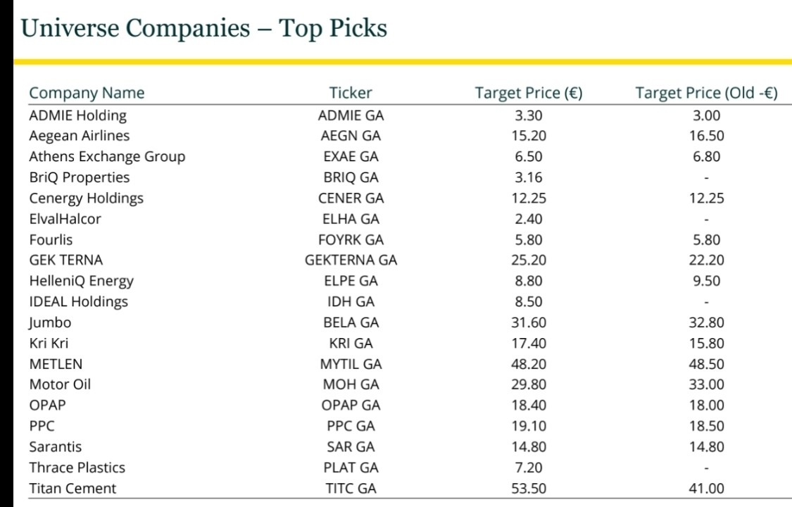 Για το 2025, η χρηματιστηριακή διατηρεί τη συγκρατημένα αισιόδοξη στάση της για τις ελληνικές μετοχές. Από τις μη τραπεζικές μετοχές, η λίστα με τα top picks περιλαμβάνει τις παρακάτω επιλογές: