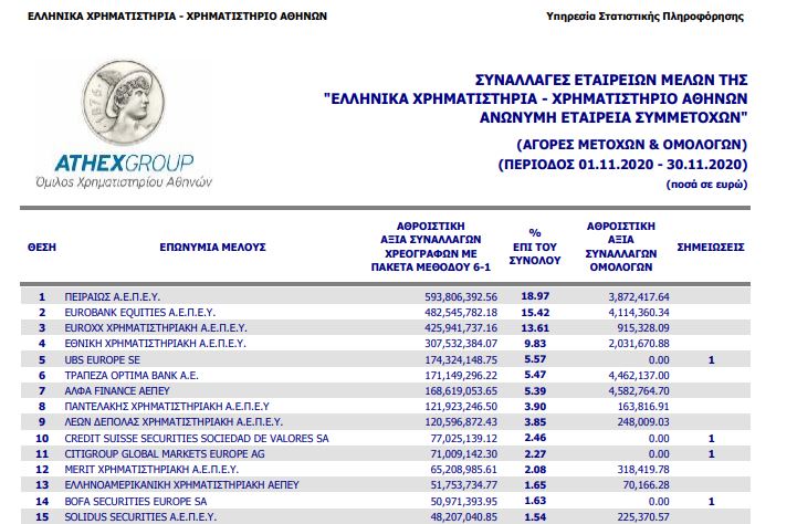 Τον μήνα Νοέμβριο, το μερίδιο αγοράς της Πειραιώς ΑΕΠΕΥ διαμορφώθηκε σε 18,97% έναντι 15,42% της Eurobank Equities και 13,61% της Εuroxx Χρηματιστηριακή.