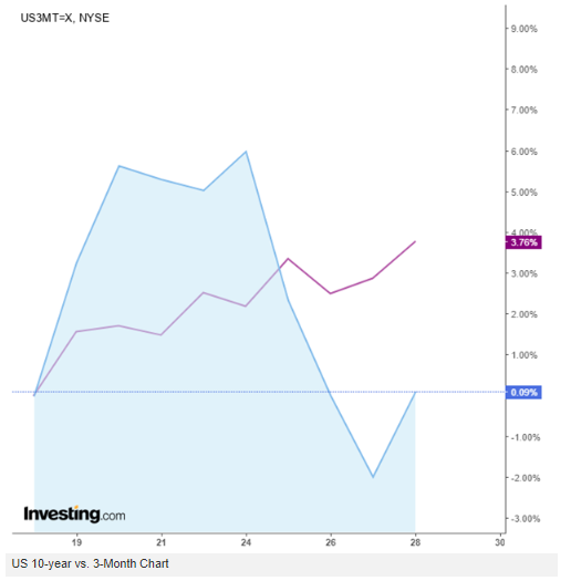 Η καμπύλη των αποδόσεων βάθυνε, όπως φαίνεται και στο παρακάτω διάγραμμα, χτυπώντας ακόμα ένα καμπανάκι κινδύνου για την ύφεση.