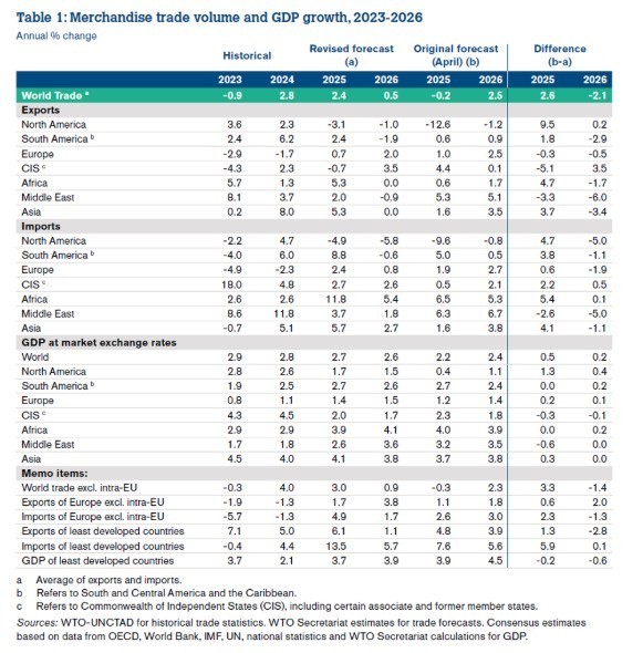 BREAKING: WTO revises #GlobalTradeOutlook: Goods trade growth forecast raised to 2.4% in 2025 but cut to 0.5% in 2026. AI product surge & frontloading boosted 2025 so far, but impact of tariffs & cooling global economy likely to set in next year.