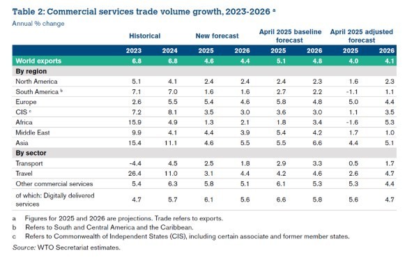 Αντίθετα, η Βόρεια Αμερική και η Κοινοπολιτεία Ανεξάρτητων Κρατών (CIS) αναμένεται να δουν πτώση στις εξαγωγές τους. Οι λιγότερο ανεπτυγμένες χώρες, παρότι θα σημειώσουν ισχυρές επιδόσεις στις εξαγωγές το 2025, αντιμετωπίζουν προβλέψεις επιβράδυνσης για το επόμενο διάστημα.