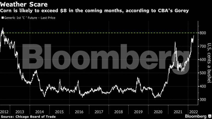 Όπως μεταδίδει το Bloomberg, ο πόλεμος δεν φαίνεται να τελειώνει σύντομα, με τον Ρώσο πρόεδρο, Βλαντιμίρ Πούτιν, να δεσμεύεται ότι η εισβολή στην Ουκρανία θα συνεχιστεί. Η σύγκρουση έχει προκαλέσει αναταράξεις στο εμπόριο σιτηρών από την περιοχή της Μαύρης Θάλασσας και θα μπορούσε να μειώσει την επόμενη σοδιά καλαμποκιού της Ουκρανίας κατά περίπου 40%. Τα συμβόλαια μελλοντικής εκπλήρωσης στο Σικάγο έκλεισαν στο υψηλότερο επίπεδο από το 2012 αυτή την εβδομάδα.