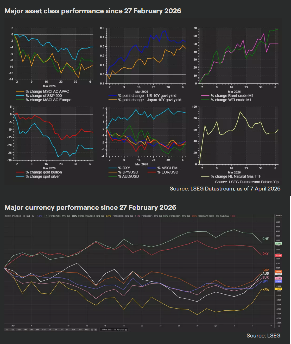 Τα κρατικά ομόλογα πωλήθηκαν μαζικά, καθώς οι αγορές προεξοφλούσαν παρατεταμένη πληθωριστική πίεση λόγω των αυξημένων ενεργειακών δαπανών, ωθώντας τις αποδόσεις σημαντικά υψηλότερα. Αυτή η άνοδος οδήγησε επίσης στην πτώση του χρυσού και του αργύρου, τα οποία υποχώρησαν κατά 17% και 28% αντίστοιχα.