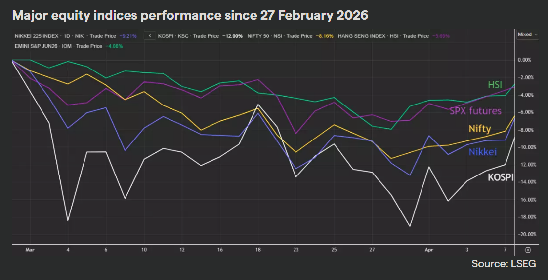 Οι μετοχές υπέστησαν γενικά απώλειες, με τις ασιατικές αγορές να υποαποδίδουν σημαντικά, δεδομένης της μεγάλης εξάρτησης της περιοχής από τις εισαγωγές ενέργειας από τη Μέση Ανατολή. Ο δείκτης KOSPI της Νότιας Κορέας κατέγραψε μέγιστη πτώση 19%, ενώ ο δείκτης CSI 300 της ηπειρωτικής Κίνας τα πήγε καλύτερα με πτώση 6%.