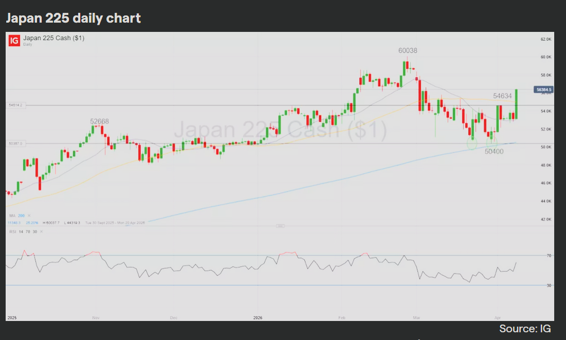 Η απότομη ανάκαμψη επιβεβαίωσε τη διαμόρφωση ενός μοτίβου double-bottom στον δείκτη Japan 225. Με τον δείκτη να ξεπερνά το ψυχολογικό όριο των 54.600, η διόρθωση φαίνεται να έχει ολοκληρωθεί και ο δείκτης έχει επαναλάβει την ανοδική του τάση.