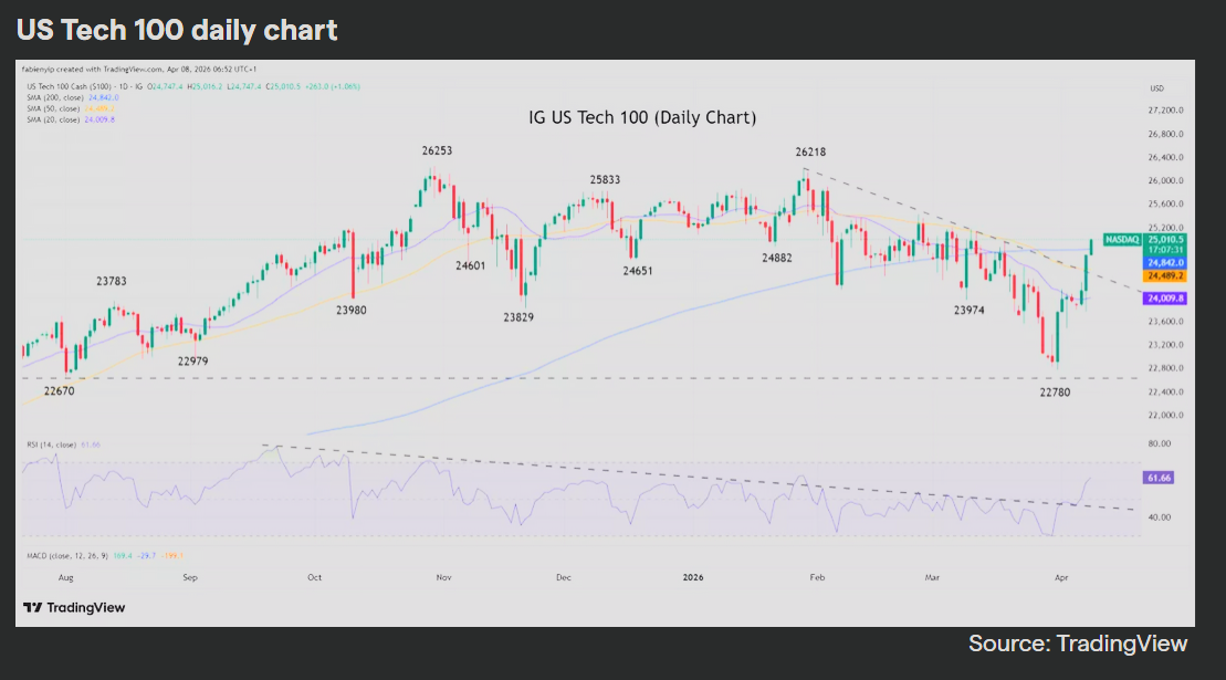 Σύμφωνα με ανάλυση του IG, o δείκτης US Tech 100 ανέκτησε τον κινητό μέσο όρο 200 ημερών μέσω της ανάκαμψης, ενώ η τεχνική δυναμική έχει επίσης βελτιωθεί, με τον δείκτη σχετικής ισχύος (RSI) να ξεπερνά την επικρατούσα γραμμή πτωτικής τάσης. Ωστόσο, θα απαιτηθεί ένα σταθερό κλείσιμο πάνω από τις 25.200 μονάδες για αρκετές συνεδρίες, προκειμένου να επιβεβαιωθεί ότι πρόκειται για κάτι περισσότερο από μια προσωρινή «ανάσα» που τροφοδοτείται από μια προσωρινή εκεχειρία.
