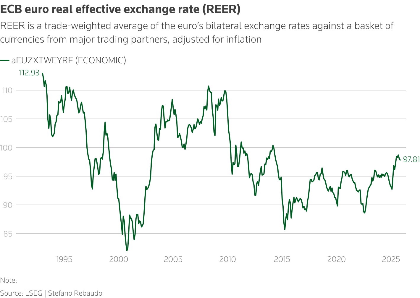 Η πραγματική συναλλαγματική ισοτιμία (RER) του ευρώ έφτασε στο υψηλό των 98,68 τον Σεπτέμβριο, το υψηλότερο από τον Μάιο του 2014. Τον Νοέμβριο ήταν στα 97,81.