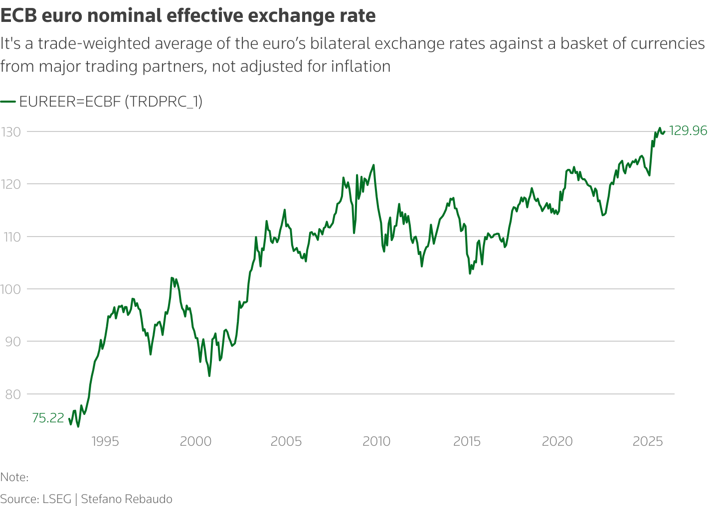 Η ονομαστική ισοτιμία, η οποία είναι περίπου 129,96, έφτασε το ρεκόρ των 130,87 τον Σεπτέμβριο, έχοντας αυξηθεί κατά 5,7% μέχρι στιγμής το 2025.
