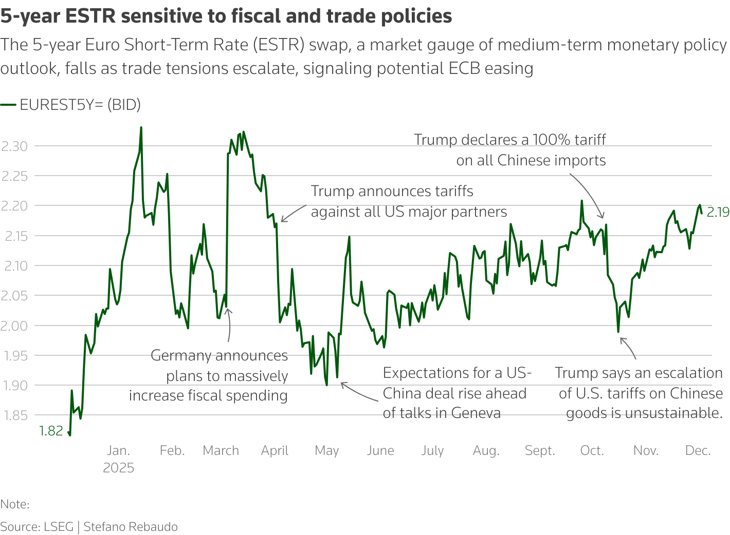 Οι αγορές δείχνουν ότι οι επενδυτές αναμένουν ότι η ΕΚΤ θα παραμείνει σταθερή τουλάχιστον μέχρι τον Μάρτιο του 2027. Ωστόσο, οι δασμοί και οι φόβοι για έναν παγκόσμιο εμπορικό πόλεμο έχουν οδηγήσει σε ανάκαμψη των τιμών από το χαμηλό επίπεδο του 1,55% που καταγράφηκε τον Απρίλιο, όταν ο Τραμπ επέβαλε δασμούς σε όλους τους σημαντικούς εμπορικούς εταίρους.