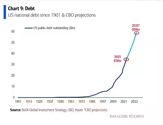 Η ομάδα της BofA Global χαρακτήρισε το χρέος και τα ελλείμματα των ΗΠΑ ως τους σημαντικότερους παράγοντες που οδηγούν στη συναίνεση για «short the long bond» (πώληση μακροπρόθεσμων ομολόγων) στη Wall Street.