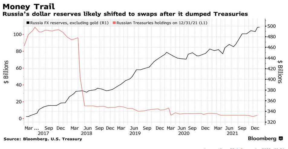 Η κεντρική τράπεζα και ο ιδιωτικός τομέας της Ρωσίας έχουν σχεδόν 1 τρισ. δολάρια ρευστό πλούτο, με πολύ μεγαλύτερο μερίδιο σε δολάρια από ό,τι πιστεύουν οι περισσότεροι, ακόμη και αφότου η χώρα πούλησε όλα τα αμερικανικά ομόλογα που κατείχε το 2018, έγραψε ο Pozsar. Υπολογίζει ότι περίπου 200 δισ. δολάρια διατηρούνται σε swaps συναλλάγματος και άλλα 100 δισ. δολάρια σε καταθέσεις σε ξένες τράπεζες.