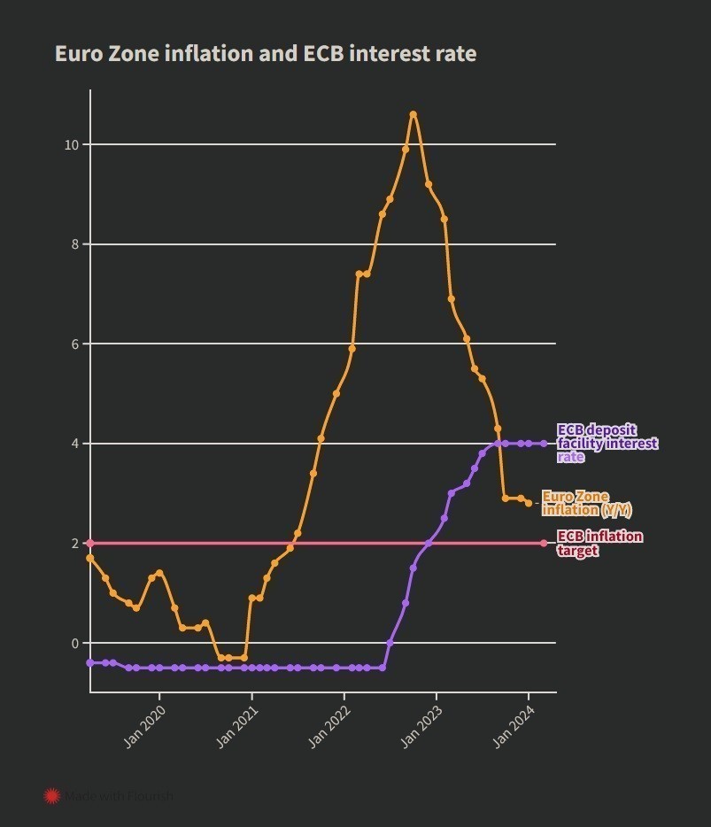 Η Ευρωπαϊκή Κεντρική Τράπεζα διατήρησε επίσης την περασμένη εβδομάδα το βασικό της επιτόκιο στο 4%, σηματοδοτώντας ότι δεν θα μειώσει τα επιτόκια πριν από τον Ιούνιο.