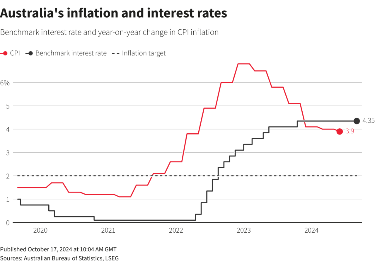 Η Κεντρική Τράπεζα της Αυστραλίας διατηρεί τα επιτόκια στο 4,35% από τον περασμένο Νοέμβριο και δεν έχει αποκλείσει περαιτέρω αυξήσεις για να επαναφέρει τον πληθωρισμό βιώσιμα εντός του στόχου του 2%-3%.