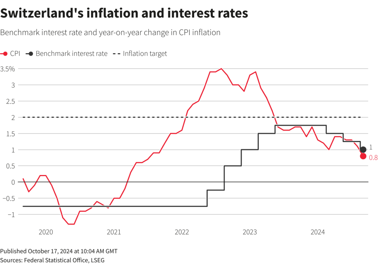 Οι αγορές τιμολογούν ισχυρές πιθανότητες να μειωθούν τα ελβετικά επιτόκια στο 0,5% έως τον Μάρτιο του 2025.