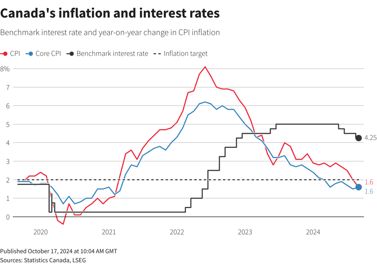 Οι αγορές δείχνουν ότι οι συναλλασσόμενοι αναμένουν ότι η Τράπεζα του Καναδά θα μειώσει τα επιτόκια για τέταρτη συνεχή συνεδρίασή της στις 23 Οκτωβρίου και βλέπουν ακόμη και πιθανότητες μιας μεγαλύτερης μείωσης κατά 50 μονάδες βάσης στο 3,75%.