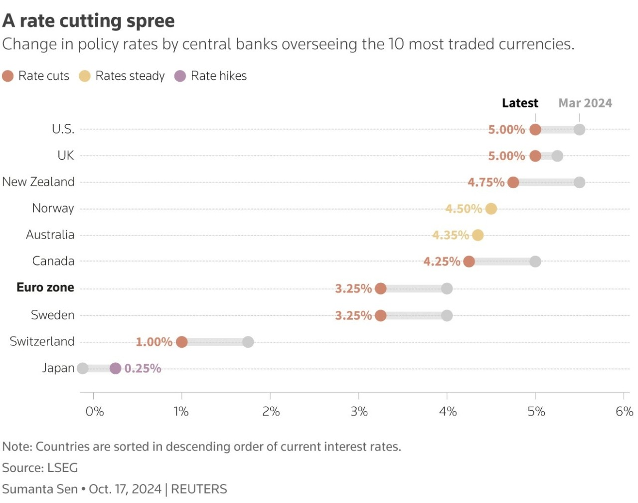 Αρκετές από τις μεγάλες κεντρικές τράπεζες των ανεπτυγμένων αγορών που παρακολουθεί το Reuters έχουν πλέον αρχίσει να χαλαρώνουν την πολιτική τους, με τις προσδοκίες για το πόσο γρήγορα θα κινηθεί η κάθε μία να ταλαντεύονται, καθώς οι υπεύθυνοι χάραξης πολιτικής τονίζουν την εξάρτηση από τα δεδομένα.