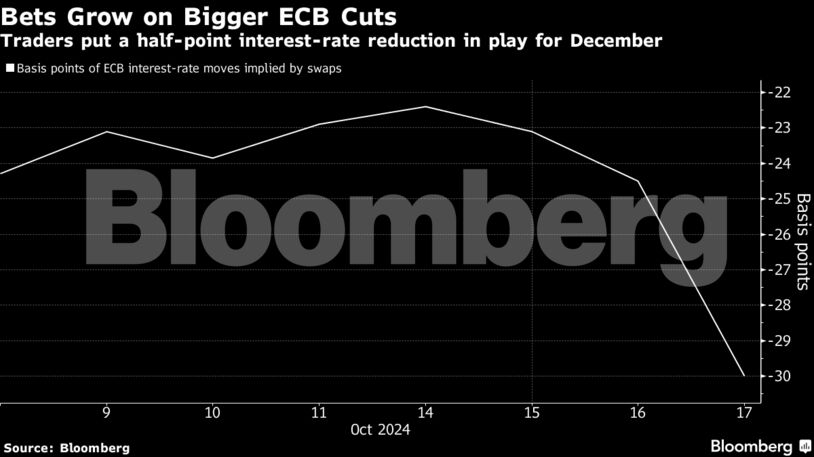 Πέρα από την πιθανότητα για μια μεγαλύτερη μείωση τον Δεκέμβριο, τα στοιχήματα των επενδυτών υποδεικνύουν ότι το επιτόκιο καταθέσεων θα πέσει από το σημερινό επίπεδο του 3,25% κάτω από το 2% μέχρι το τέλος του 2025. Το ευρώ υποχώρησε και τα ομόλογα βραχυπρόθεσμης διάρκειας σημείωσαν ράλι, καθώς οι επενδυτές αφομοίωσαν τις νέες προοπτικές.
