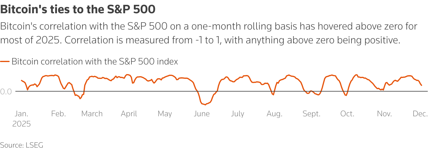 Οι σημαντικότεροι δείκτες μετοχών στον κόσμο κατέγραψαν επίσης μια ταραχώδη χρονιά, φτάνοντας επανειλημμένα σε ρεκόρ υψηλών τιμών και στη συνέχεια υποχωρώντας, καθώς οι ανησυχίες για τους δασμούς, τα επιτόκια και μια πιθανή φούσκα τεχνητής νοημοσύνης ταρακούνησαν τις αγορές. Ενώ οι μετοχές καταγράφουν ως επί το πλείστον άνοδο από την αρχή του έτους, η συνολική συσχέτιση του bitcoin με αυτές έχει ενισχυθεί σημαντικά φέτος.