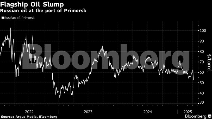 Η ποιότητα Urals από το λιμάνι Πριμόρσκ της Βαλτικής Θάλασσας κατρακύλησε στα 52,76 δολάρια την Παρασκευή, σύμφωνα με τα στοιχεία της Argus Media, όπως μεταδίδει το Bloomberg. Τα βαρέλια της χώρας διαπραγματεύονται με βαθύ discount έναντι του παγκόσμιου δείκτη αναφοράς Dated Brent από τότε που ξεκίνησε η εισβολή, πριν από τρία και πλέον χρόνια.
