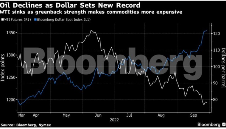 Η άνοδος του αμερικανικού νομίσματος — το οποίο πήρε ώθηση από την πιο επιθετική τροχιά αυξήσεων των επιτοκίων της Fed από τη δεκαετία του 1980 — καθιστά τα εμπορεύματα που αποτιμώνται σε σε δολάρια πιο ακριβά για τους περισσότερους αγοραστές. Αναμένονται περαιτέρω αυξήσεις επιτοκίων της Fed , με τους υπεύθυνους χάραξης πολιτικής, συμπεριλαμβανομένου του Τζέιμς Μπούλαρντ, να επαναλαμβάνουν την πρόθεσή τους να δαμάσουν την άνοδο των τιμών.