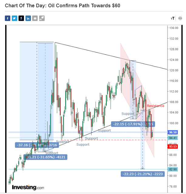 Αξίζει να σημειωθεί ότι εδώ και μεγάλο διάστημα (από τις αρχές του περασμένου Ιουλίου) οι αναλυτές προειδοποιούσαν ότι είναι πιθανό να δούμε το WTI και στα 60 δολάρια, αν συνεχιστεί η οικονομική επιβράδυνση, πόσο μάλλον αν πάμε σε ύφεση, όταν ακόμα η τιμή του ήταν στα $97, καθώς έβλεπαν ότι ήταν αδύνατον να ανακτήσει το κρίσιμο επίπεδο των $100.