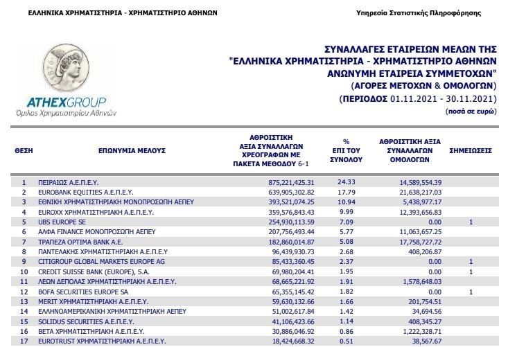 Σύμφωνα με τα στοιχεία του Χρηματιστηρίου Αθηνών, η αθροιστική αξία των συναλλαγών της εταιρείας τον μήνα που μόλις τελείωσε, ανήλθε σε 875,22 εκ.ευρώ και διατήρησε την Πειραιώς ΑΕΠΕΥ στην πρώτη θέση, όπως άλλωστε και για την περίοδο Ιανουαρίου – Νοεμβρίου όπου η αξία των συναλλαγών υπερέβη τα 6,6 δισ.ευρώ.