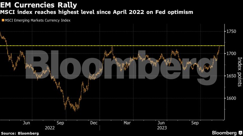 Ο δείκτης αναφοράς MSCI EM Currency Index σημείωσε άνοδο 0,3% νωρίτερα σήμερα, ανεβάζοντας τα φετινά του κέρδη στο 3,4%. Το ορόσημο αυτό έρχεται μετά από ανάκαμψη από τις αρχές Οκτωβρίου, καθώς η βελτίωση των στοιχείων για τον πληθωρισμό στις ΗΠΑ πυροδοτεί τις προσδοκίες για τερματισμό των αυξήσεων των επιτοκίων από την Ομοσπονδιακή Τράπεζα των ΗΠΑ και πιθανή μείωσή τους έως τα μέσα του 2024.