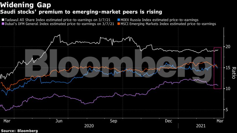 Ακριβότερες σε σχέση με αυτές των ανταγωνιστών της γίνονται οι μετοχές της Σαουδικής Αραβίας, παίρνοντας ώθηση από το πρόσφατο ράλι στις τιμές του πετρελαίου.