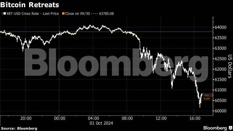 Το μεγαλύτερο κρυπτονόμισμα υποχώρησε έως και 5,7% στα 60.168 δολάρια την Τρίτη, που είναι η μεγαλύτερη ημερήσια πτώση από τις 6 Σεπτεμβρίου. Άλλα altcoins υποχώρησαν περαιτέρω, με το Ether να πέφτει πάνω από 6%, το Dogecoin να βυθίζεται 8% και το Avalanche να διολισθαίνει πάνω από 7%.