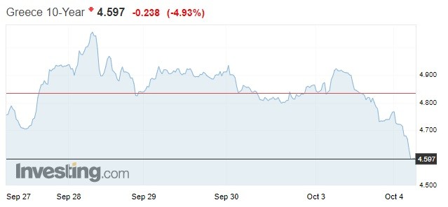 Από τις μεγάλες ωφελημένες του βελτιωμένου κλίματος είναι η Ελλάδα, η οποία βλέπει την απόδοση του 10ετούς ομολόγου να κατέρχεται κατά 23 μονάδες βάσης και να διαμορφώνεται στο 4,597%. Ας σημειωθεί ότι την προηγούμενη εβδομάδα είχε φθάσει έως το 5%.