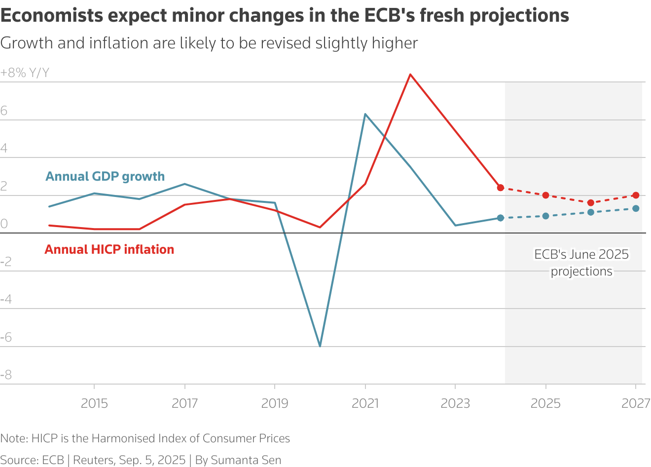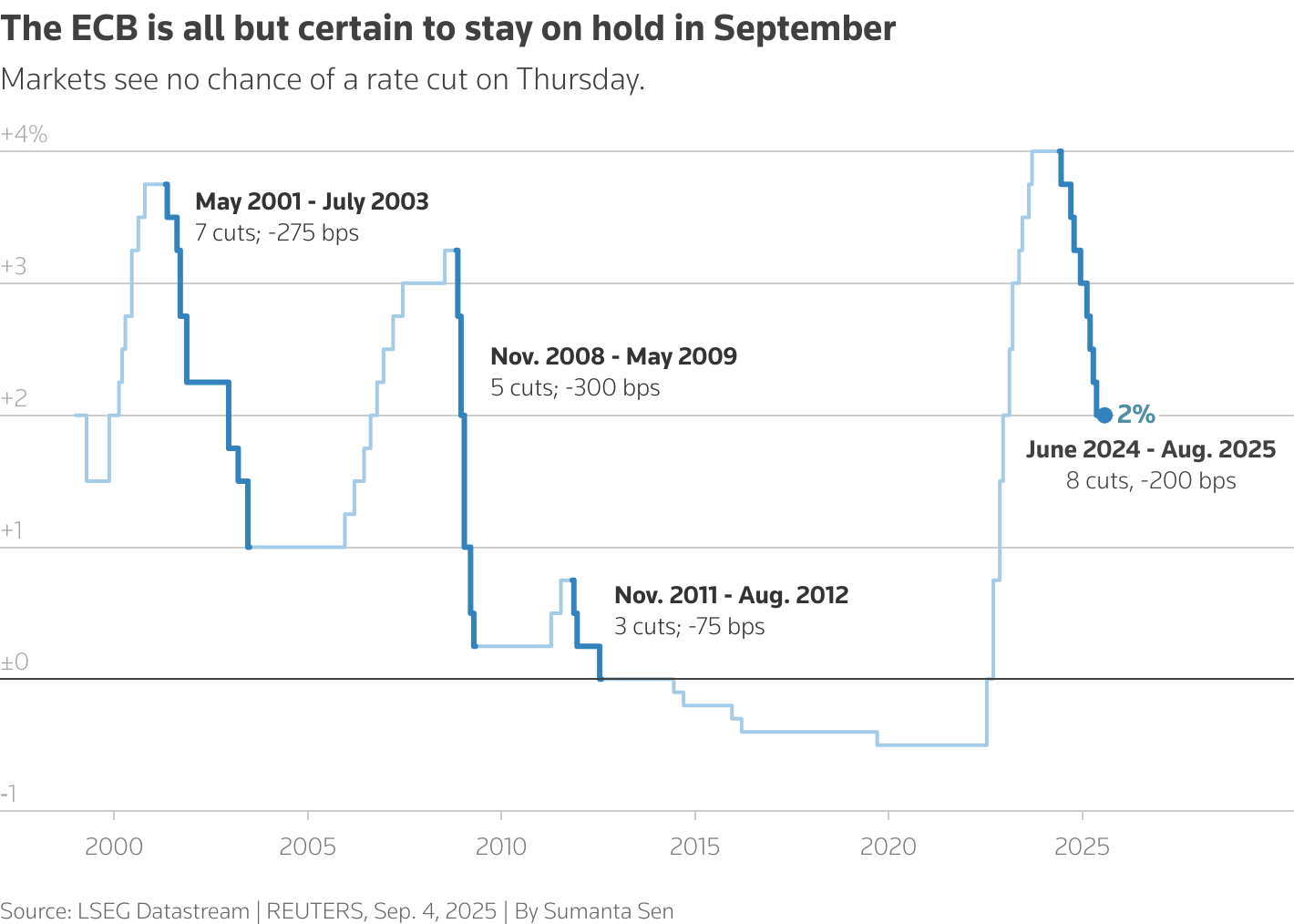 Η Ευρωπαϊκή Κεντρική Τράπεζα αναμένεται να διατηρήσει τα επιτόκια αμετάβλητα για δεύτερη συνεχόμενη συνεδρίαση την Πέμπτη 11 Σεπτεμβρίου, με τους επενδυτές να παρακολουθούν για τυχόν ενδείξεις ότι η τράπεζα έχει ολοκληρώσει τον κύκλο μείωσής της.